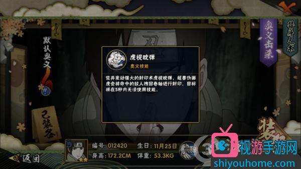 奥义技能:虎视眈眈,奥义总共有3段伤害,第一段会召唤老虎,第二段老虎窜出去,最后一段将目标封印到卷轴中最后爆炸,伤害结束后目标的会被封印。在使用奥义时,竞技场是时间静止状态,当第一段伤害攻击目标时,可以替身跑路。但当第2段在老虎攻击到目标的瞬间可以替身,如果这时没替身,那就会吃满伤害无法替身,直到封印结束。奥义的第3段爆炸攻击到目标,在范围内同样会被封印术封印。奥义前可以使用2技能蹭豆,奥义后也是可以接平A与2技能。