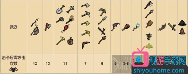 下表是依照玩家的基本伤害,使用每种武器杀死吐网蜘蛛所需要的攻击次数。天候棒不包含在里面,因为它造成的伤害是随机的。