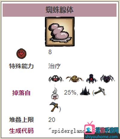 在游戏中,蜘蛛腺体可以通过击杀各种蜘蛛获得,蜘蛛一般会在晚上的时候出现,只有它们被攻击或巢穴附近的蜘蛛网被踩踏时才会在白天出现,除了杀死蜘蛛外,玩家还可以通过开采石笋蛛巢来掉落,获得的蜘蛛腺体能够对自身或其他生物使用,每次使用会恢复8点生命,并且还可以使用蜘蛛腺体制作治疗药膏。