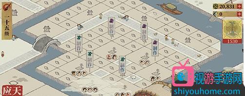 3、下方三个戏台和一排树。还有一个成衣店(财神爷的光辉在那照了一格,所以也会有加成!那排四个都是衣店,上边四画室,还可以加)。
