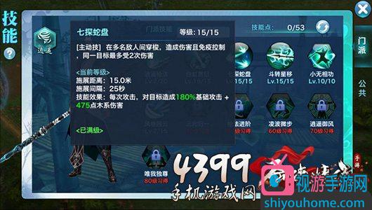 3.七探蛇盘:加5点。此技能乃是逍遥派神技,可以躲避任何技能,且不可被选定,对于此技能,小编将之看做保命技,不需要它来打伤害,只需要存在就好,所以小编的建议是这个技能先不着急加点,只需要战斗的时候释放得当就好。