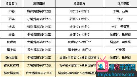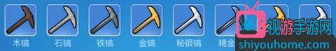 1、从木镐开始,其道具品质由上至下逐渐提升。其中,品质高的均可以挖掘品质低一级的镐所适用的矿物;