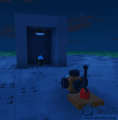 接着隔开一段距离,在正对着第一个信号中继器的地方放置一个拉杆。之后,再放置一个信号中继器在拉杆的前方,注意黑色部分面对拉杆,蓝色部分面对第一个信号中继器。这样,我们就做好了一个自动开关灯系统,让我们快点试试看吧(为了方便看出效果,这里在黑夜里测试)!