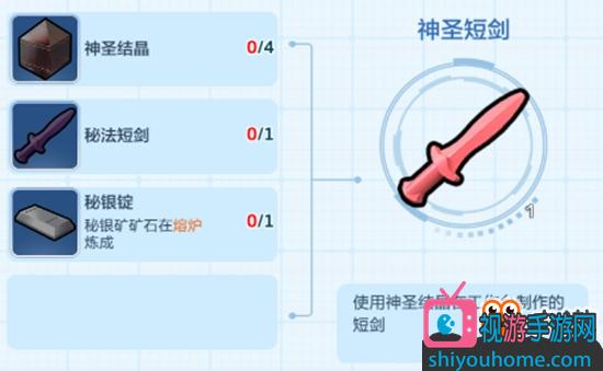消耗4个神圣结晶,1个秘法短剑,1个秘银锭在工作台--装备进行合成