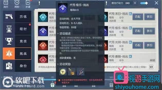 代号·极乐副本在玩家等级达到55级的时候开放挑战。活动全天开放,但是普通难度的代号极乐副本玩家每周只有两次挑战机会。而挑战难度的代号极乐副本一周则可以挑战三次,这三次分别是周一到周五2次,周末一次。