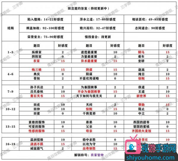 题目1:农家,+15好感度。纵横家,+2好感度。阴阳家,+0好感度。