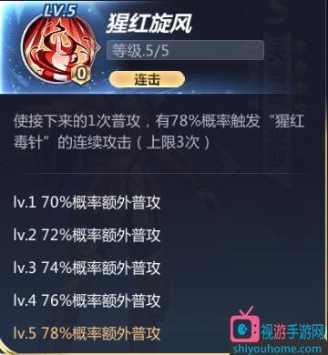 使接下来的一次普攻,有70%(72%/74%/76%/78%)概率触发“猩红毒针”的连续攻击,(上限3次)