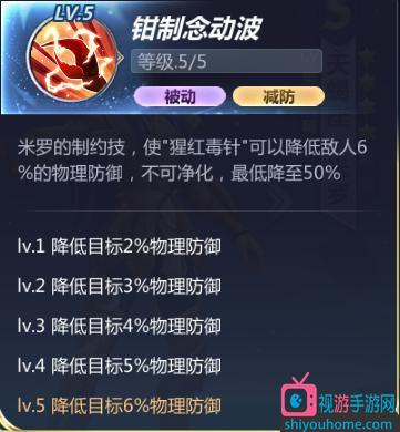 米罗制约技,使“猩红毒针”降低敌人2%(3%/4%/5%/6%)的物理防御,不可净化,最低降至50%。