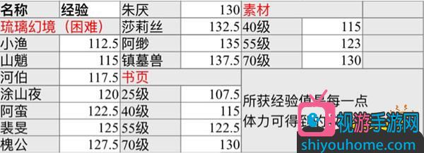这是每一点体力可以得到的经验值,这里boss副本只放了困难本的,因为普通本和困难本的经验差距很大,如果是缺某个材料,可以去刷刷普通本。新的活动金龙玉雨每个副本的每点体力收益都是130所以就没放在上面