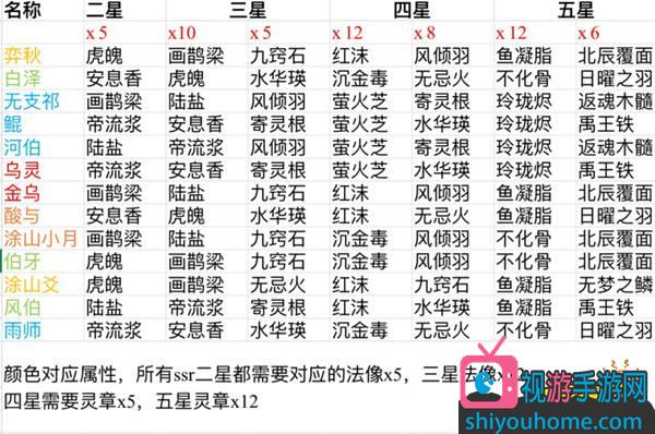萌新刚开始练的都是ssr,所以我只总结了ssr的。金用白虎法像,木用青龙法像,水用玄武法像,火用朱雀法像,土用黄麟法像(手机做表格真的肝疼…)