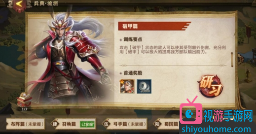 进入游戏首页,点击【演武场】,选择【流派兵典】,拉到最右边,会看到一个帅气的军师周瑜,不仅为玩家点出了破甲流的训练要点,还准备了丰厚的奖励,张角碎片5个和银币若干,点击【研习】。