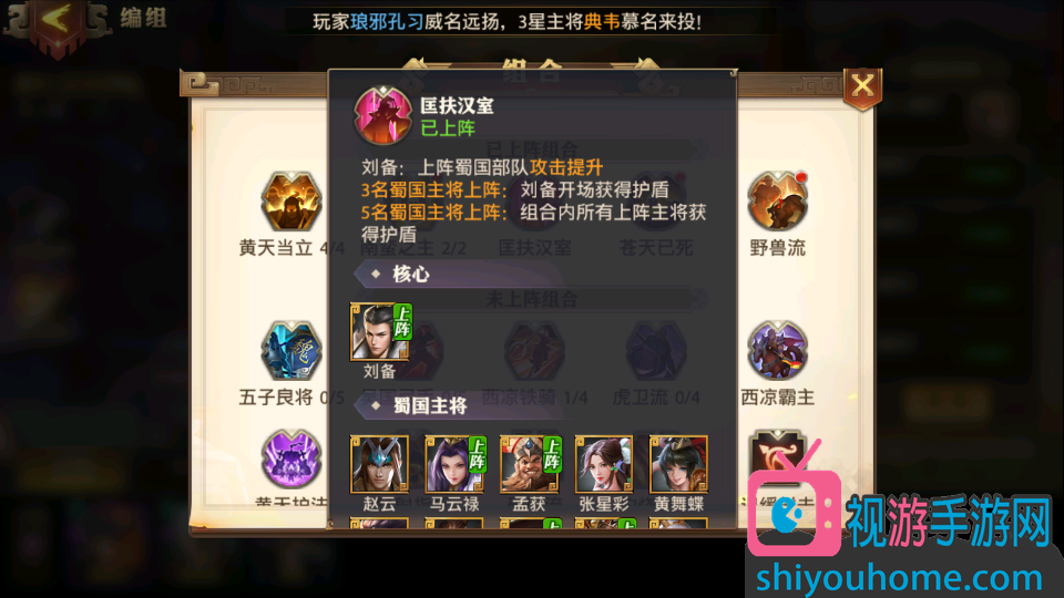 1、上阵角色:核心主将为刘备,主将为蜀国阵营全部武将。