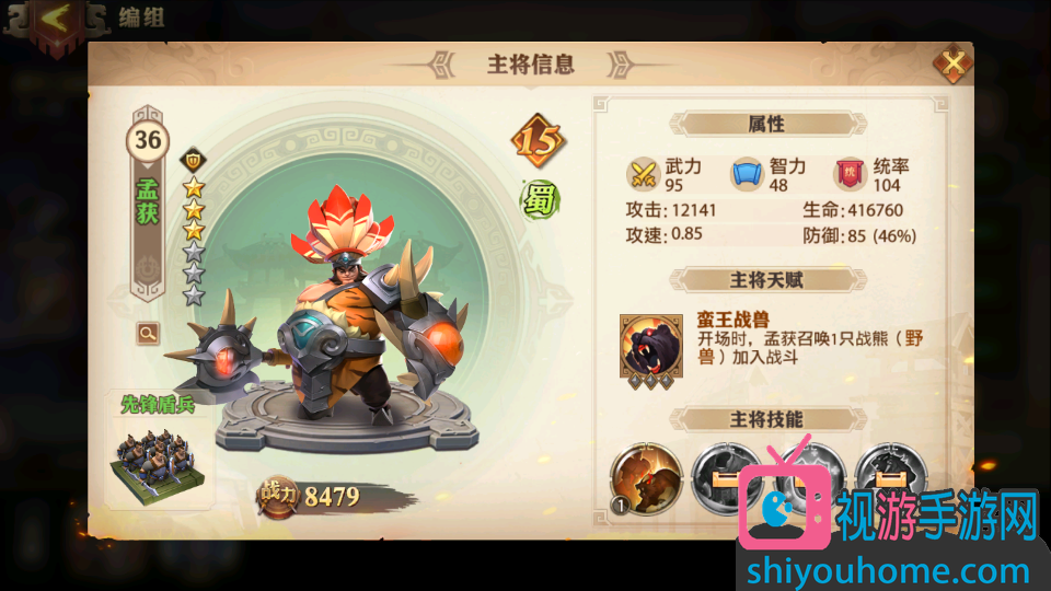 4、孟获:蜀国盾兵主将,召唤战熊作战,全场野兽增益,野兽流派核心。