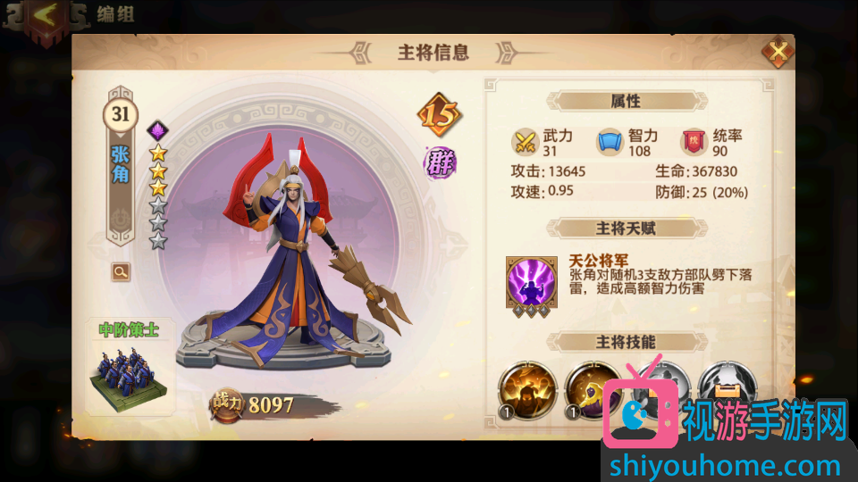 1、张角:群雄谋士主将,范围伤害,将击杀的士兵转化为黄巾力士,黄巾流派核心。