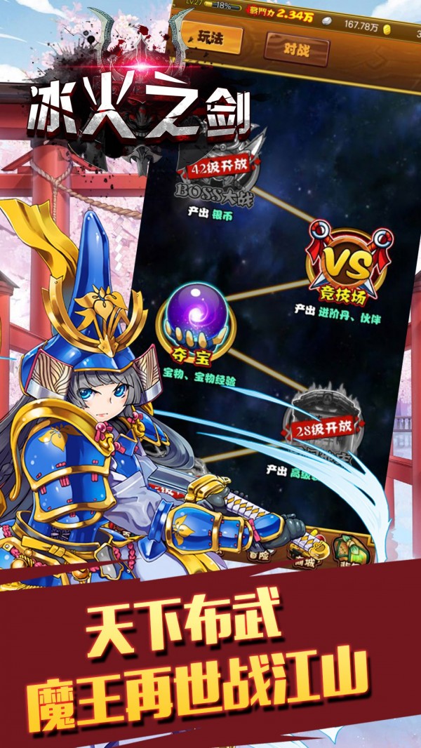 冰火之剑是一款以日本战国时期为背景的全新Q版战略卡游。游戏包括100多名著名的战国玩家,广阔无际的战争场面,爽快淋漓的操作手感,带领玩家开启一场史诗级作战盛宴!游戏的操作简易便捷,非常容易上手,满足各种层次玩家的需求。同时游戏中的所有战斗都是通过自动化进行,军事指挥官们可以自由行动,无需复杂的行动。除此之外,每场战斗只需要大约15秒钟。既简单又提神,给玩家带来最简单纯粹的游戏乐趣。玩家可以使用不同的团队和编队实现高战略;也可以研究对手的形成,并将他们与不同的军事指挥官结合起来组成自己的队伍,征战沙场,抢夺领土。无论哪种玩法,都能给你带来无限的游戏快感!在这里,率领织田信长、丰臣秀吉、武田信玄、德川家康等历史名将,跨越时代征服天下!夺取城堡,掠夺资源,建造高塔,打造自己强大的王国,史诗般的战斗尽在你的指尖!多姿多彩的每日任务和支系任务,等你来战!Q萌可爱的人物角色,等待与你结伴同行!更有贴心的挂机系统,彻底释放你的双手,轻松获取经验和收集金币,躺下倒立都可以升级。豪华大礼免费赠送,抽奖活动不断进行,丰富资源畅享不停,让你开局就有极品装备。精美复古时尚的界面设计风格,高清绮丽的场景地图,迅速燃烧热血PK对决,在掌上也能开启酣畅淋漓的国战盛会!伴随着流血溅出,点燃,电闪和绮丽的动画特效,气温光影即时智能化转变,展现影片级的图象品质。快来视游手游网感受这异域风情的国战盛典吧!
