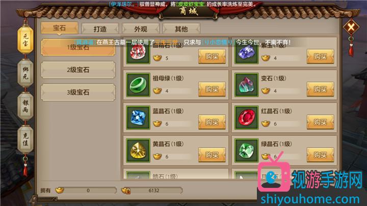 1、商城购买:在元宝商城可以买到1级-3级的各种宝石,五颗相同的宝石可以合成一颗更高级的宝石,而少侠可以通过充值获得更多的元宝。