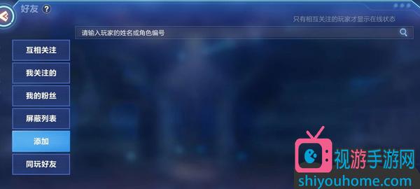 打开的好友系统界面中找到【添加】按钮输入玩家的姓名或者角色编号添加好友即可;