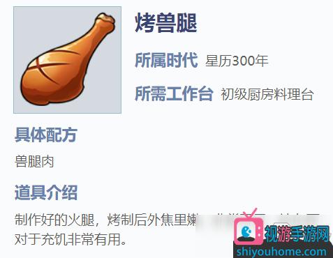 烤兽腿增加的饱食度还是比较高的,而且制作的材料也非常容易获得,建议大家可以适当的制作一些携带在身上。