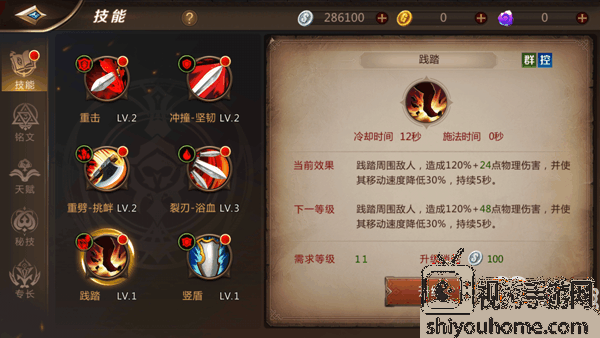 践踏冷却时间为12秒,瞬发技能,使用技能将践踏周围敌人,造成120%+大量物理伤害,并使目标移动速度降低30%,持续5秒。此技能冷却时间较短,还是群攻群控技,打副本时很好用。