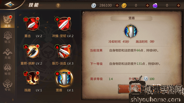 高级盾墙(lv.45):剑盾格挡的冷却时间降低2秒,持续时间提升0.4秒;