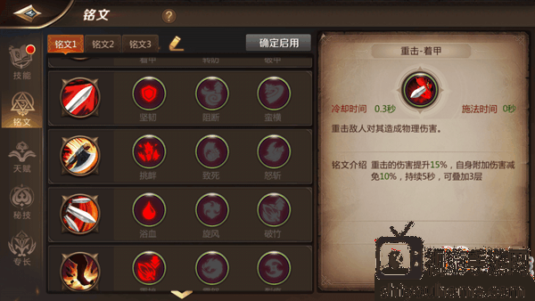为技能安装铭文可以提升技能效果或者让技能附带各种强势特效,每一个技能都有3个铭文可供选择,但是一个技能同一时间只能激活一个铭文,战士铭文选择方向大致有这3种:重装防御、团队掌控、冲锋破敌。