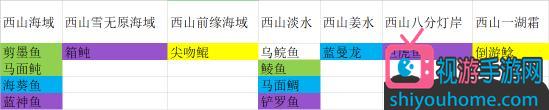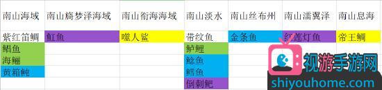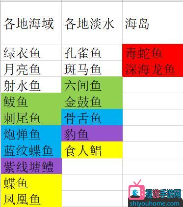 鱼的稀有度:鱼分为淡水鱼和海鱼,颜色代表稀有度,红>黄>紫>蓝>绿>白。
