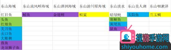 以下几张是各大陆的产出,各大陆有自己的通用产出,同时特殊地点有特殊鱼,比如我在东山流风峤海域钓鱼,能钓上来的鱼就是就是各地海域+东山海域+东山流风峤海域的所有鱼。