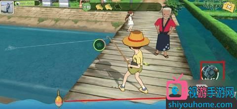 钓鱼的时候,屏幕下面的浮漂会左右快速移动,当浮漂移动到装着鱼的瓶子上时,点击“拉杆按钮"