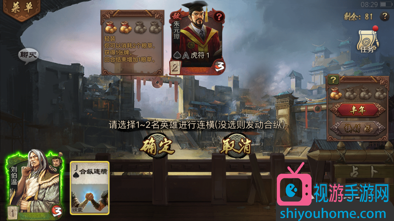 从上图可以看到,会出现选择英雄的提示,我们可以选择不超过两个的目标将他们连接起来。在游戏回合中我们将荆轲和诸葛亮两个选定,然后点击确定。