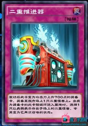 预组里的二重陷阱,可以给二重怪兽进行攻击力700的增幅,被当装备破坏的时候可以给场上的一张二重怪兽赋予二重召唤后的效果,这个效果可以配合超二重自排连锁的情况下进行推进器c1,超二重c2的combo让被苏生后的战破怪得到效果,是一个不错的坑(当然dl里面是没有自排连锁的机制如果到时候不能使用的话建议换别的坑代替)昨晚测试是可以达成的。