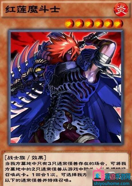 这张卡能够在我方的墓地中只有三张通常怪兽卡的时候将两只通常怪兽除外,并且将红莲魔斗士从手卡中特殊召唤入场,还有一回合一次的,从墓地中将一只通常怪兽返回场上的能力,是一个非常好的铺场效果。