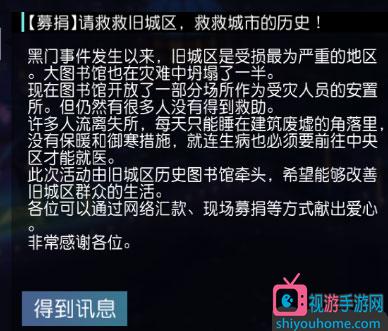 获取信息后,巡查旧城区:进入支线【旧城区的募捐箱】,选择【现在就捐】
