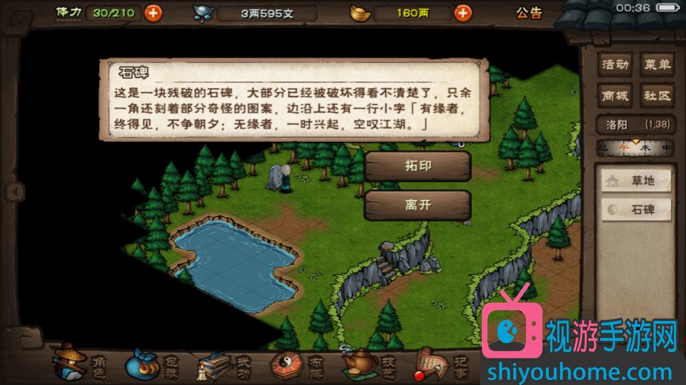 包袱里查看完整的拓片,看到数字十、三、三、七,所以到洛阳(13.37)搜索,选择转动柱子,进入地道。第一个山洞(8,2)处打开铁皮箱获得250文和2紫玉髓。进入(23.14)第二个山洞。依次跳到(5.19)(5.16)(2.15)(2.12)(3.9)(3.7)(8.7)(8.2),最后来到(7,1)处打开宝藏。