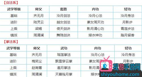 泠月宫武学以剑法、掌法为主,分支两派。一开始玩家仅可拜新手导师齐无月为师,成为外门弟子。等出师后可选择拜入云韶院或瑶光院继续深造【一旦选择,无法更改】,学习本门的掌法或剑法。