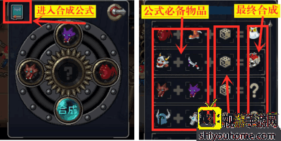 在关卡中会出现合成炉,合成炉中有合成方法,合成一次才会知道合成的道具效果(这休闲鞋道具在商人和副本中是获取不到的,需要特定的道具来进行合成),合成公式中显示必备的道具为必须物品,骰子为添加随机道具即可。图鉴合成均为稀有道具,不按照图鉴中合成基本都是垃圾道具。