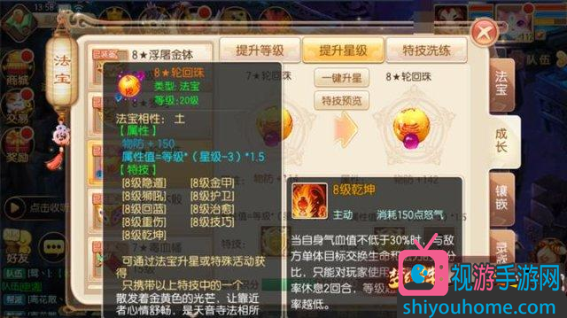 轮回珠作为我们可携带的六件法宝之一,相信并没有得到太多的关注,因其增加属性不如浮屠金钵、獠牙的用处大,且特技效果方面也有些差强人意,所以整体价值不高!但在培养时还是得跟上进度的,毕竟聊胜于无嘛!