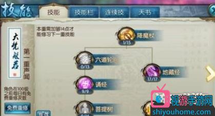 首先第一重声闻,降魔杖,普攻,后期可能加,目前没有多余的点。六道轮回,打NPC会用用,打人,持续时间长,攻击低,回复少,简直给对方创造攻击你的机会,也没有多的点去点他,放弃。诵经,满级附加1464攻击,控制对方,仅剩的唯一控制,未命中都可以睡对方,加满。地藏经,天音的天生命中低,这个加满,不解释。菩提树,呃,有阵灵蓝足够用了,目前没有多的点数,暂时放弃。