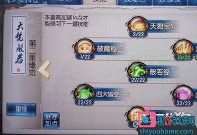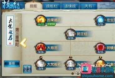 第三重是个耗点的地方。都是好技能。首先因果循环,防御技能,加满,大慈悲,气血被动,气血对天音这么重要的属性,加满,明镜台,防御被动,满,站得住才会有机会出输出。大梵班若,要的就是这个技能,满。